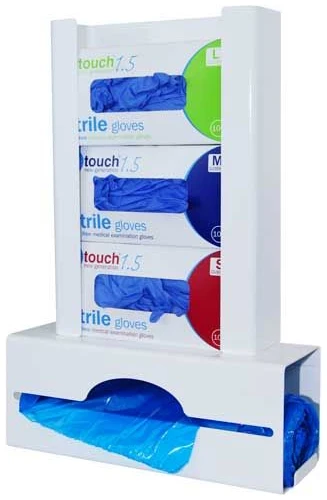 Keeps work surfaces clear and enables easy dispensing of gloves and aprons
